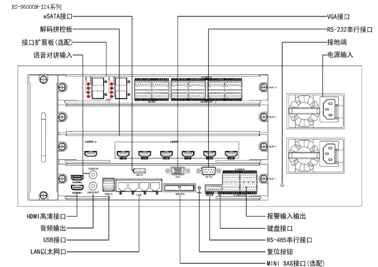 DS-96000N-I24/H系列是海康威视自主研发的新一代NVR&解码上墙一体机,全插拔模块化无线缆设计,H.265&H.264码流混接混解, 4K高清上墙,轮巡拼控,一机两用,既可作为NVR进行本地独立工作,也可进行电视墙的拼控管理,同时可联网组成一个强大的防范系统。